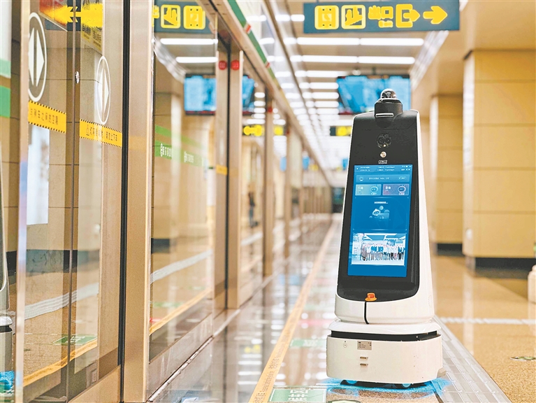 除了站務服務機器人,“機器人家族”中還有智能巡檢機器人,不僅能識別進站客流量,還可以通過語音提醒乘客有序進站、自覺排隊和主動安檢,維護站內秩序;在巡檢過程中對站內設施進行高溫預警、環(huán)境溫濕度感知、空氣質量檢測;對站內消防設備是否齊備、是否存在“跑冒滴漏”等情況進行監(jiān)測,發(fā)現(xiàn)異常及時預警。