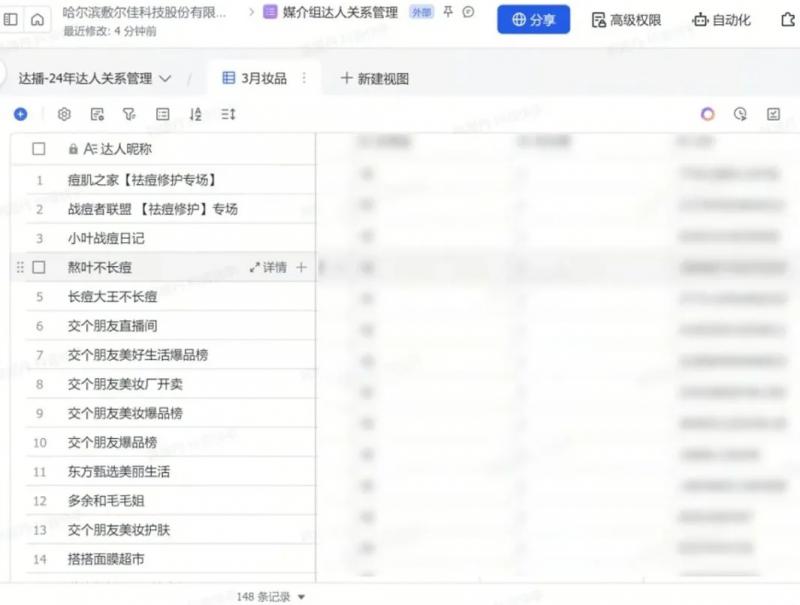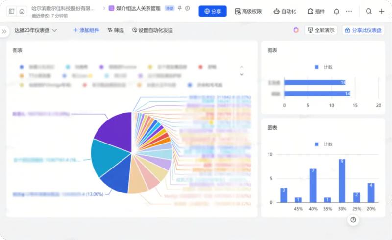 由于器械字號產(chǎn)品的特殊性,現(xiàn)在敷爾佳通過飛書在線文檔審批達人,將達人數(shù)據(jù)填寫上報,上級在線同步審批達人,跟進確定合作。直播中,用飛書云盤儲存資料,將達播錄屏,產(chǎn)品資料等數(shù)據(jù),同步云盤,方便各部門查看,調(diào)取相關(guān)資料。直播后,利用飛書多維表格將達人信息,合作傭金,產(chǎn)出 GMV,對接人等重要信息歸攏一起,形成多維表格方便組織內(nèi)互相查閱填寫, 通過儀表盤的功能體現(xiàn)出哪些達人是優(yōu)質(zhì)合作達人,并為二次投放合作提供了參考價值。