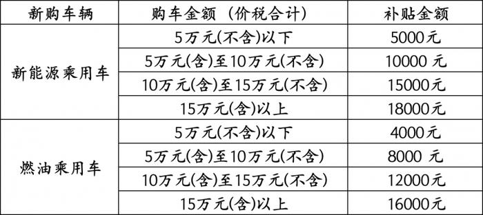 按《通知》要求,新補(bǔ)貼標(biāo)準(zhǔn)分為四檔。新購(gòu)車輛為新能源乘用車的,發(fā)票金額在5萬(wàn)元(不含)以下,每輛車補(bǔ)貼5000元;5萬(wàn)元(含)至10萬(wàn)元(不含),每輛車補(bǔ)貼10000元;10萬(wàn)元(含)至15萬(wàn)元(不含),每輛車補(bǔ)貼15000元;15萬(wàn)元(含)以上,每輛車補(bǔ)貼18000元。新購(gòu)車輛為燃油乘用車的,5萬(wàn)元(不含)以下,每輛車補(bǔ)貼4000元;5萬(wàn)元(含)至10萬(wàn)元(不含),每輛車補(bǔ)貼8000元;10萬(wàn)元(含)至15萬(wàn)元(不含),每輛車補(bǔ)貼12000元;15萬(wàn)元(含)以上,每輛車補(bǔ)貼16000元。