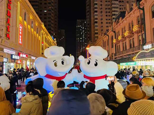 在冰雪旅游持續(xù)升溫之際,白象也將品牌文化與冰雪藝術(shù)完美融合,賦予古老街道全新活力。在中央大街核心地段,兩只萌態(tài)可掬的小象雪雕歡快地?fù)粽?,醒目的“白象中?guó)面”LOGO和湯好喝高湯面桶置于雪雕下方,仿佛在傳遞白象的熱情邀約,迅速成為游客鏡頭下的“寵兒”。