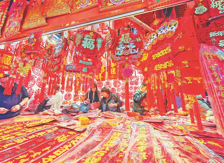 春節(jié)臨近,哈爾濱市道里區(qū)一處批發(fā)市場內(nèi),市民們正在購買各種節(jié)日飾品,用來裝點(diǎn)家居,迎接新春佳節(jié)的到來。蛇年主題的燈籠、對(duì)聯(lián)、福字等擺滿了柜臺(tái),紅紅火火,喜慶氣氛濃厚。人們臉上都洋溢著幸福的笑容,一邊逛一邊買,個(gè)個(gè)滿載而歸。