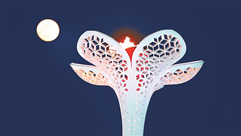 亞冬會火炬與正月十五的月亮交相輝映。王世琛攝