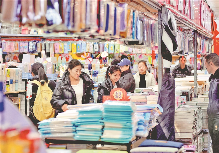 19日,哈爾濱市道里區(qū)一處大型批發(fā)市場(chǎng),許多家長帶著孩子前來選購文具。
