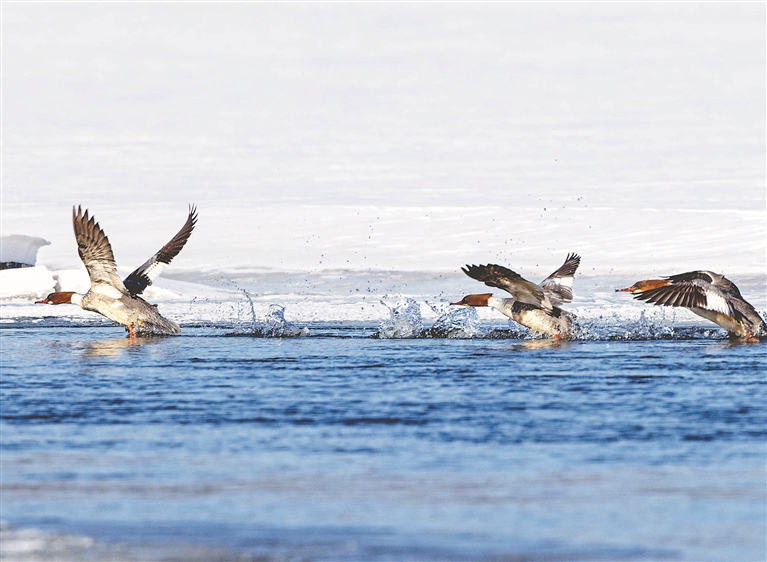 本報訊(黃曉光 記者郭俊峰)近日,國家一級保護(hù)動物秋沙鴨翩然而至,為小興安嶺的初春增添了別樣生機。它們在澄澈的水面上悠然游弋,時而將頭扎進(jìn)水里,探尋著水下的美味;時而歡快地拍打著翅膀,濺起晶瑩的水花。