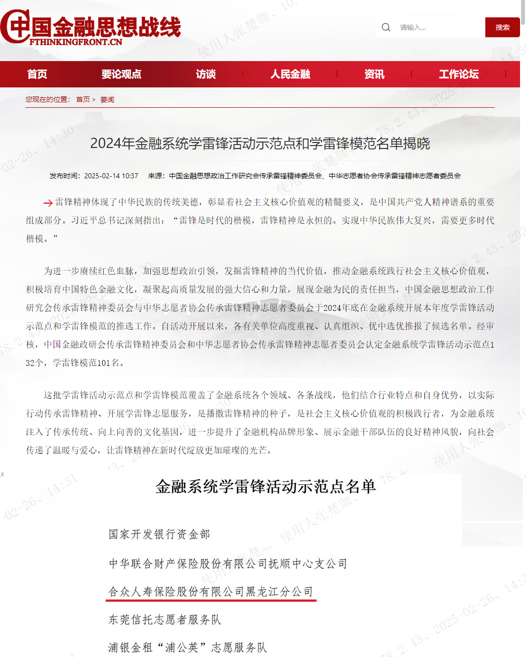 在2024年金融系統學雷鋒活動示范點和學雷鋒模范評選中,合眾人壽黑龍江分公司黨支部脫穎而出,成功獲評學雷鋒示范點,成為合眾全系統唯一獲此殊榮的單位。這一成績的取得,不僅是合眾人壽黑龍江分公司的榮耀,更是整個合眾系統的驕傲,為行業(yè)樹立了榜樣。