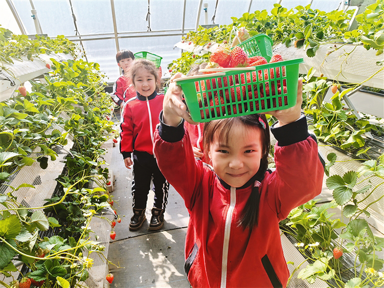 在位于陽(yáng)明區(qū)樺林鎮(zhèn)的唐櫻園生態(tài)農(nóng)場(chǎng)里,整齊排列著24棟智能溫室大棚。在11號(hào)草莓大棚里,來自同心幼兒園的小朋友正在采摘草莓,孩子們興奮地圍著草莓觀察,“草莓真好看,草莓好甜??!”
