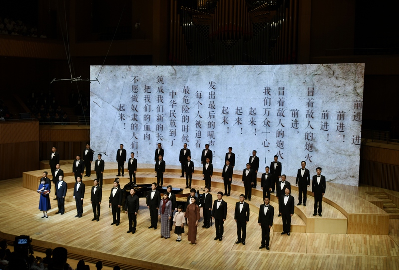 第一篇章《松花江上》以《長(zhǎng)城謠》的泣血鄉(xiāng)愁與《義勇軍進(jìn)行曲》的全場(chǎng)肅立高唱,訴盡抗戰(zhàn)時(shí)期的流亡之痛與民族豪情,更創(chuàng)新植入“童年、少女、青年”三代“蕭紅”扮演者(張舒涵、鄭楚琪、尤泓斐)與合唱團(tuán)的情景互動(dòng)。第二篇章《抗戰(zhàn)的烽火》中,《五月的鮮花》《露營(yíng)之歌》《保衛(wèi)黃河》等作品以合唱與立體站位,緬懷趙一曼、楊靖宇等英烈,再現(xiàn)全民抗戰(zhàn)的壯闊圖景。第三篇章《文脈永續(xù)》則通過(guò)魯迅、茅盾等文學(xué)名家對(duì)蕭紅的評(píng)價(jià)、跨年代讀者代表致敬及《致祖國(guó)》的磅礴合唱,彰顯其文學(xué)精神在新時(shí)代的傳承。