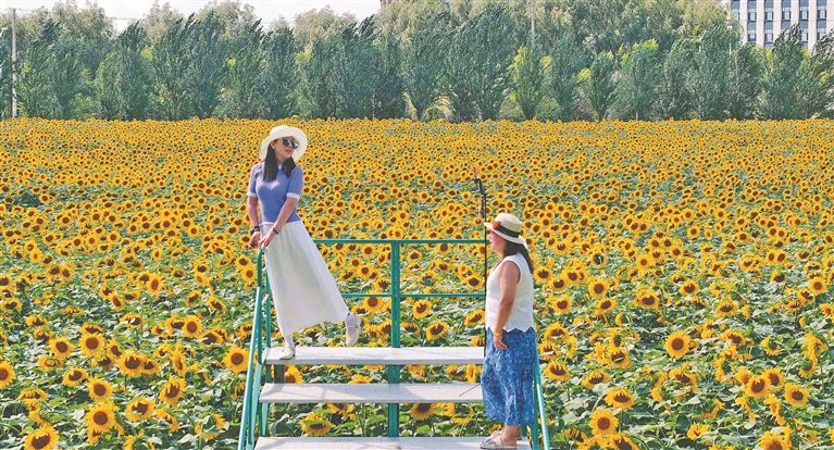 近日,哈爾濱市東方學(xué)院的校園里,30萬株向日葵進(jìn)入盛花期,層層疊疊的金黃花瓣在校園里組成金色矩陣,連蜂蝶振翅都沾滿蜜糖色的光斑。風(fēng)掠過時(shí),葉片翻卷出翡翠色的浪涌,花盤碰撞發(fā)出細(xì)雨般的窸窣聲,空氣里浮動(dòng)著類似烤面包的溫暖香氣?;êig的小橋上,愛花的市民在這里打卡拍照,定格最美瞬間。