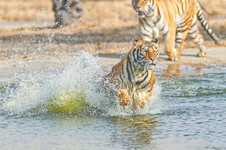 為提高游客觀賞體驗(yàn),園區(qū)通過(guò)工作車、無(wú)人機(jī)等多種方式,引導(dǎo)東北虎進(jìn)行水中捕食等,激發(fā)東北虎的野性與活力的同時(shí),為游客呈現(xiàn)一場(chǎng)真實(shí)、震撼的視覺(jué)盛宴。
