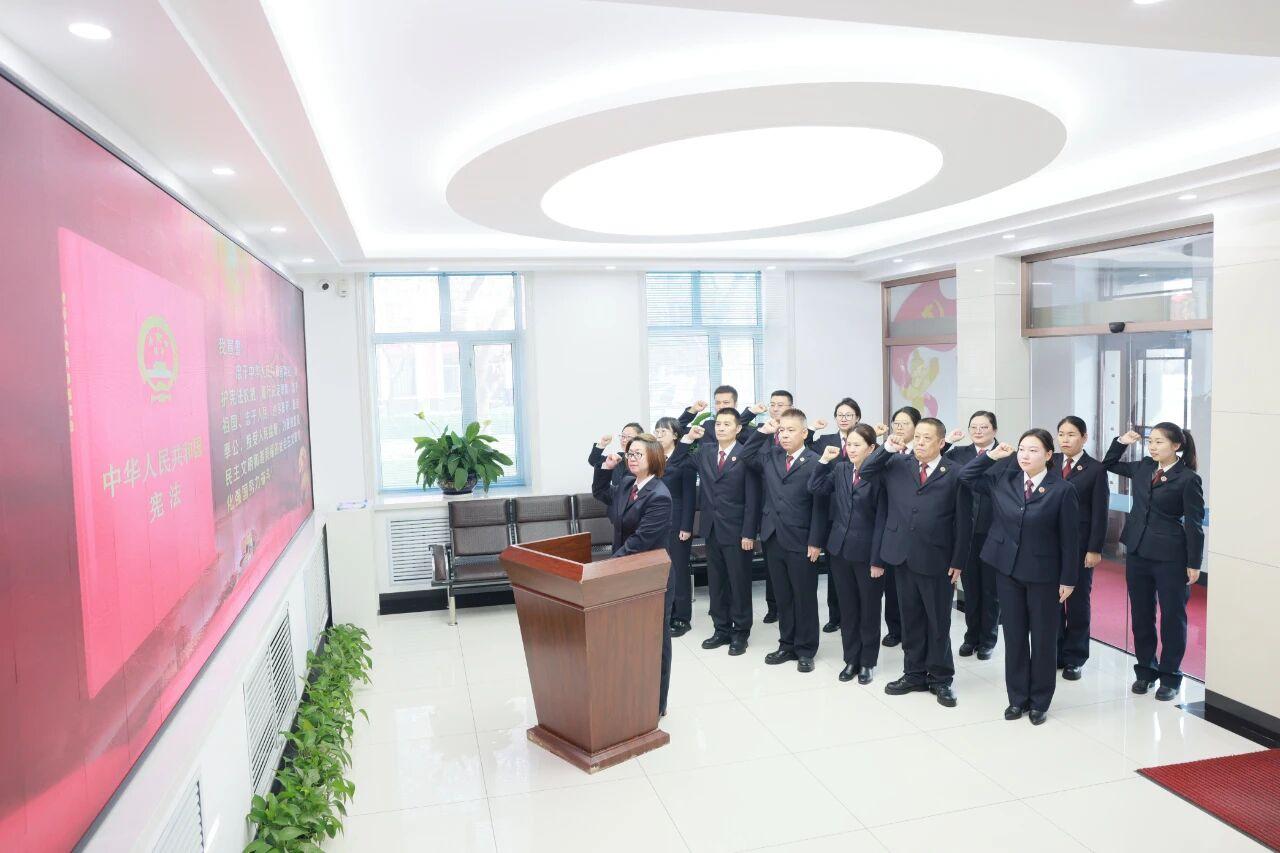 “我宣誓:忠于中華人民共和國憲法,維護(hù)憲法權(quán)威,履行法定職責(zé),忠于祖國、忠于人民……”在黨組書記、檢察長趙麗葳帶領(lǐng)下,全體干警舉起右拳,目光堅(jiān)定,跟誦誓詞,鏗鏘有力的誓言,久久回響,激蕩人心。傳遞著檢察人員忠誠履職盡責(zé)、維護(hù)公平正義的堅(jiān)毅決心,是初心使命的再宣誓,是接續(xù)奮斗的再出發(fā)。