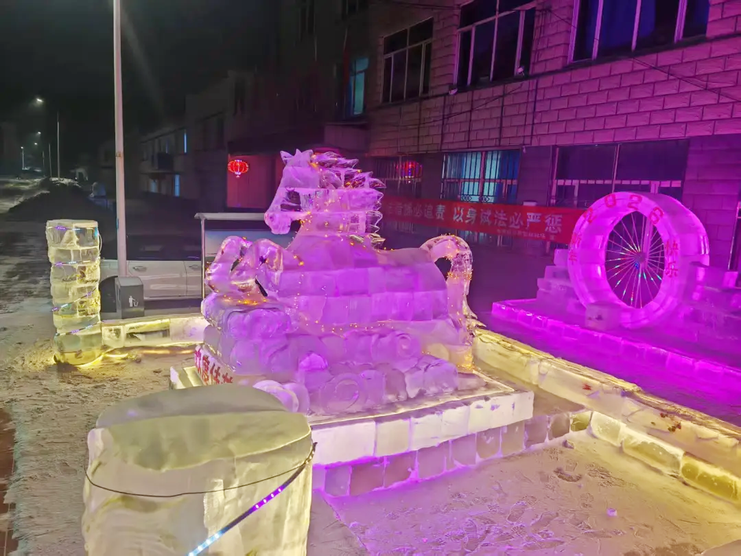 活動現(xiàn)場,專業(yè)技術工人憑借精湛技藝,專注勾勒駿馬整體輪廓,對眼部、鬃毛等關鍵部位精雕細琢,力求每一處細節(jié)都精準靈動;林場干部職工則主動扛起取冰、補冰、轉運等“硬核”任務,大家分工明確、默契配合,叮叮當當?shù)墓ぞ咔脫袈?、此起彼伏的互助吆喝聲,交織成冬日里最熱鬧的樂章。經過十余天的奮戰(zhàn),一尊尊栩栩如生的冰雕驚艷亮相,并成為林場及周邊區(qū)域的“新春網紅地標”,不少職工家屬、周邊群眾紛紛慕名而來,拍照打卡、定格年味瞬間,歡聲笑語為林場增添了更多溫馨氛圍。