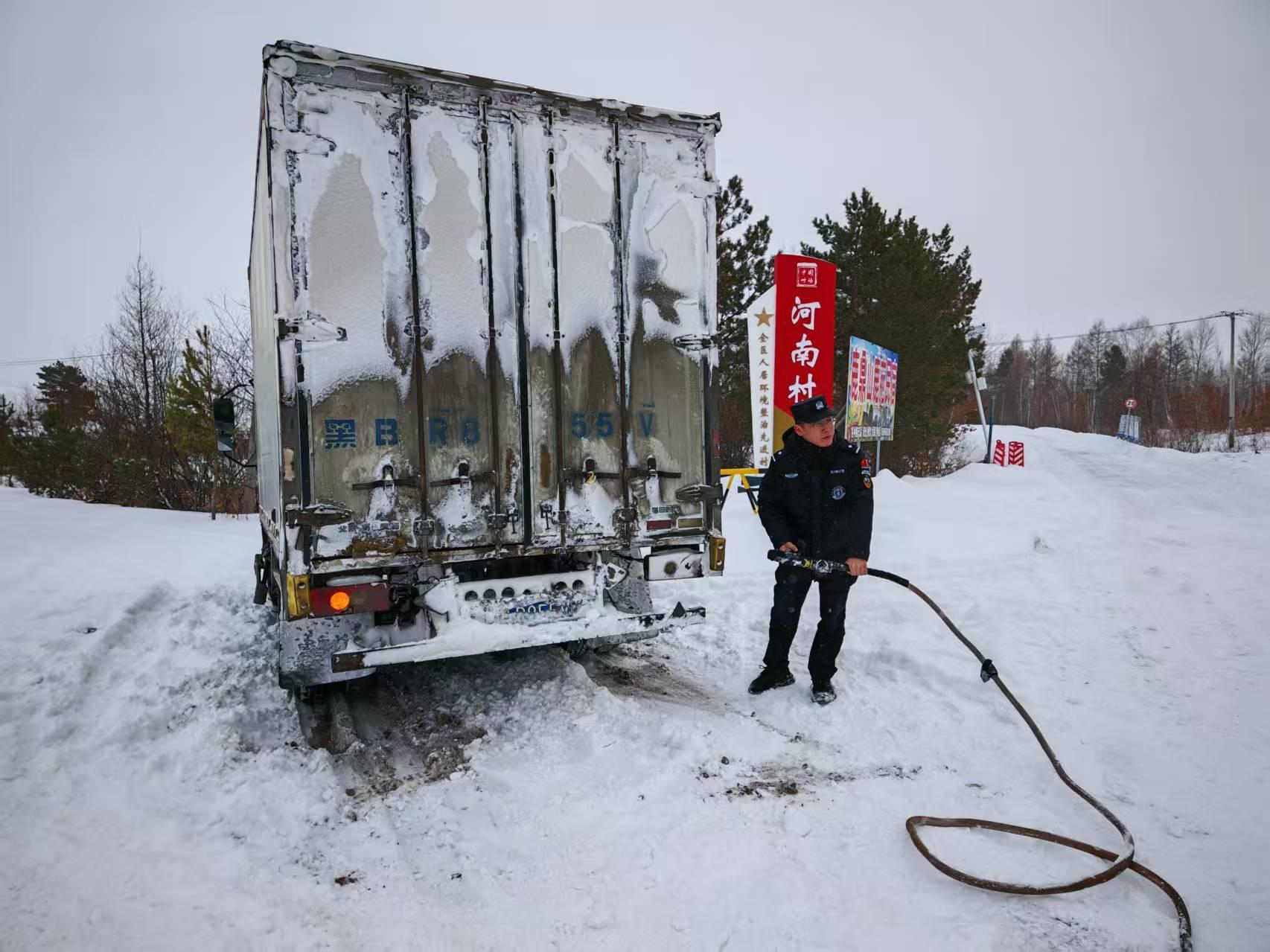 交警大隊(duì)接到G331國(guó)道河口執(zhí)勤點(diǎn)求助稱有一輛廂式貨車因積雪過(guò)厚、路面濕滑、不慎陷于深雪中無(wú)法移動(dòng),導(dǎo)致車輛被困。