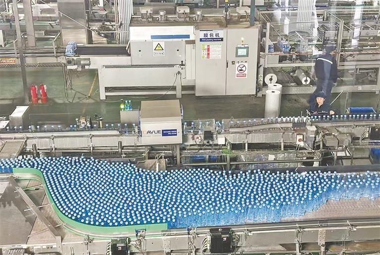 “吹瓶、灌裝、旋蓋一體機是我們生產線上最有含金量的設備,瓶坯經過高溫加熱、壓縮空氣吹制,再完成灌裝、旋蓋,全程無菌操作,確保每一滴水都純潔無瑕?!鄙a車間主任劉恒介紹,該設備生產能力可達每秒10瓶,搭配全新的視覺檢測儀、稱重機和每分鐘可打包30箱產品的箱包機,讓生產效率與產品標準雙提升。