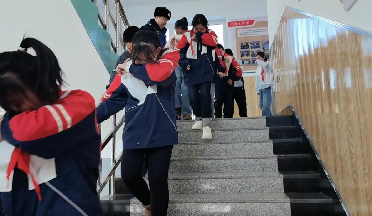 學(xué)生們?cè)谙佬麄鲉T與班主任的指引下有序開展應(yīng)急疏散演練(胡春磊 攝)